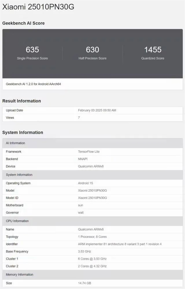 目前,该机的跑分已经现身Geekbench数据库,型号为“25010PN30G”,预计是小米15 Ultra国际版。