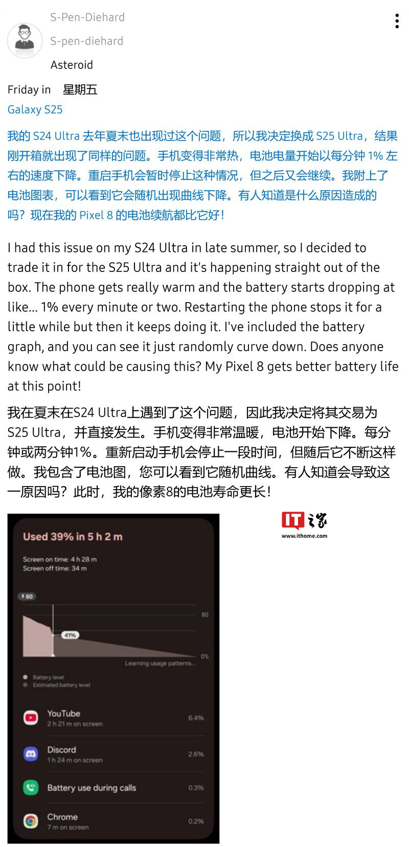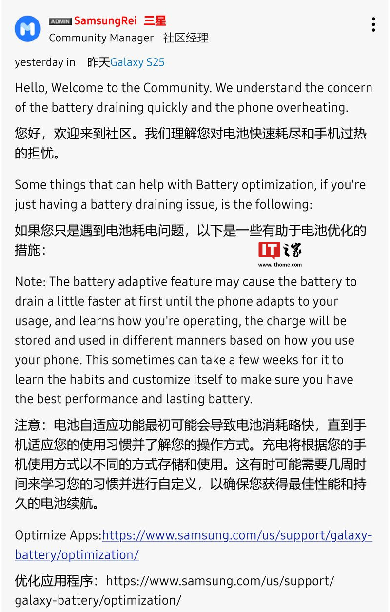 IT之家 2 月 5 日消息,科技媒体 SamInsider 昨日(2 月 4 日)发布博文,报道称三星 Galaxy S25 Ultra 手机用户在社区反馈,存在电池快速耗尽和发热问题。三星社区经理已回复该问题,并分享了故障排除步骤。