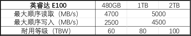 品牌官方此前确认 E100 包含 480GB 和 1TB 与 2TB 三个容量,具有 3 年保修,顺序读写和耐用度可见IT之家所整理下表,但包括随机读写在内的更多详细参数尚缺。