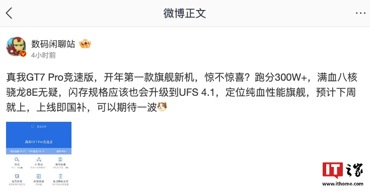 IT之家 2 月 5 日消息,博主 @数码闲聊站 今日分享了 realme 真我 GT7 Pro 竞速版手机跑分截图(成绩超 300 万),并透露新机定位纯血性能旗舰,闪存规格“应该”升级至 UFS 4.1,预计下周发布,同时上线即支持国补。
