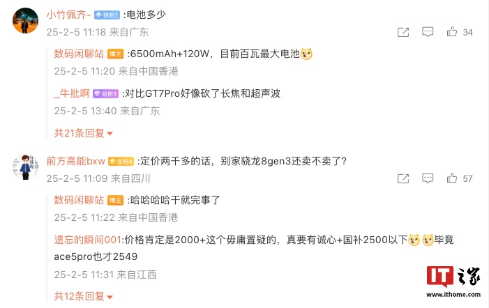 另外,博主还在评论区回复了部分网友的问题:针对新机电池和充电情况,博主称“6500mAh+120W,目前百瓦最大电池”;针对用户猜测其定价 2000 多元,博主回复“哈哈哈哈干就完事了”。