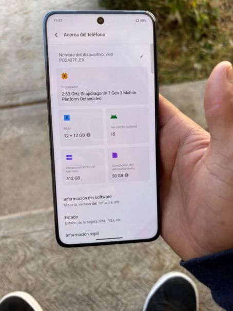 “关于手机”页面透露了一些规格,例如骁龙 7 Gen 3 芯片、12GB RAM、12GB 虚拟内存、512GB 内部存储空间以及基于 Android 15 的 Funtouch OS 15。