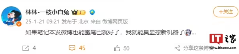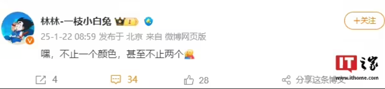 不仅如此,荣耀中国区副总裁、智慧生活业务部部长 @林林-一枝小白兔 早前也连续发布两条微博,暗示已经拿到荣耀笔记本新品,并透露不止两种配色。
