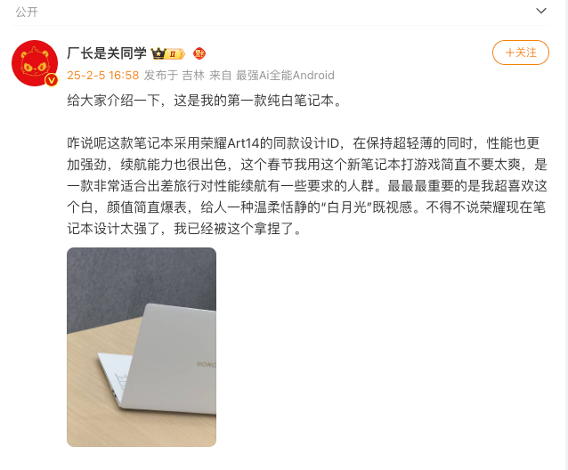 根据该博主的介绍,荣耀这款笔记本采用荣耀 Art14 的同款设计 ID,在保持超轻薄的同时,性能也更加强劲,续航能力也很出色。他声称这个春节用这款新笔记本打游戏非常爽,是一款非常适合出差旅行、对性能续航有一些要求的人群的产品。