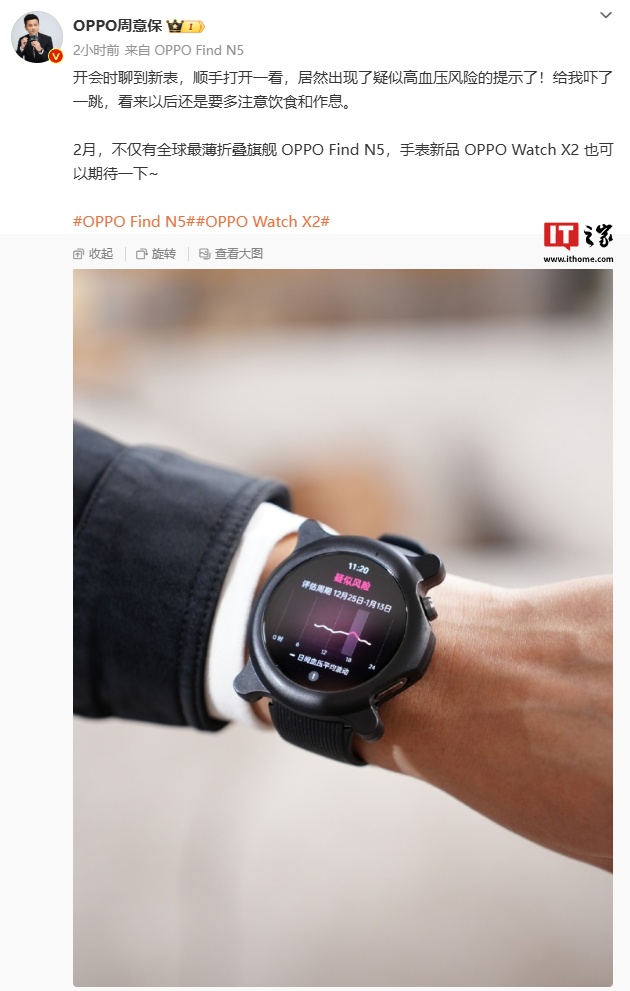 OPPO Find 系列产品负责人周意保曾在 1 月发文透露,OPPO Watch X2 智能手表将支持高血压风险提示,会和 Find N5 折叠屏手机一起在 2 月发布。