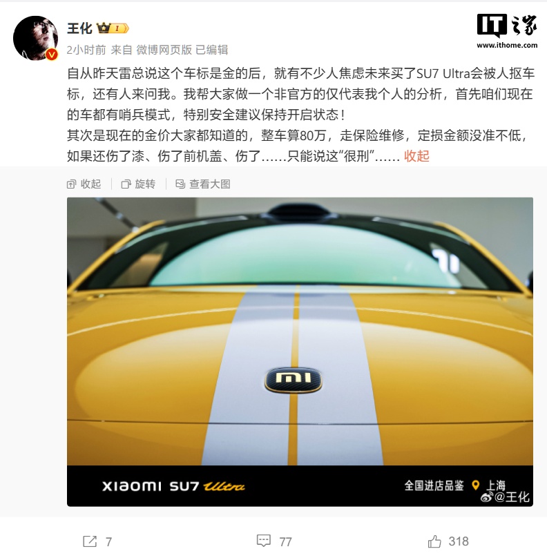 在今日早些时候,小米公关部总经理王化也发文称:“自从昨天雷总说这个车标是金的后,就有不少人焦虑未来买了 SU7 Ultra 会被人抠车标,还有人来问我。我帮大家做一个非官方的仅代表我个人的分析,首先咱们现在的车都有哨兵模式,特别安全建议保持开启状态!”