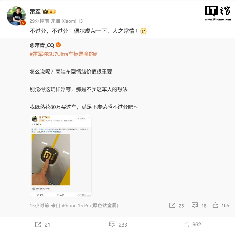 被回复的这名网友表示:“(雷军称 SU7 Ultra 车标是金的)怎么说呢?高端车型情绪价值很重要。别觉得这玩样浮夸,那是不买这车人的想法。我既然花 80 万买这车,满足下虚荣感不过分吧?”