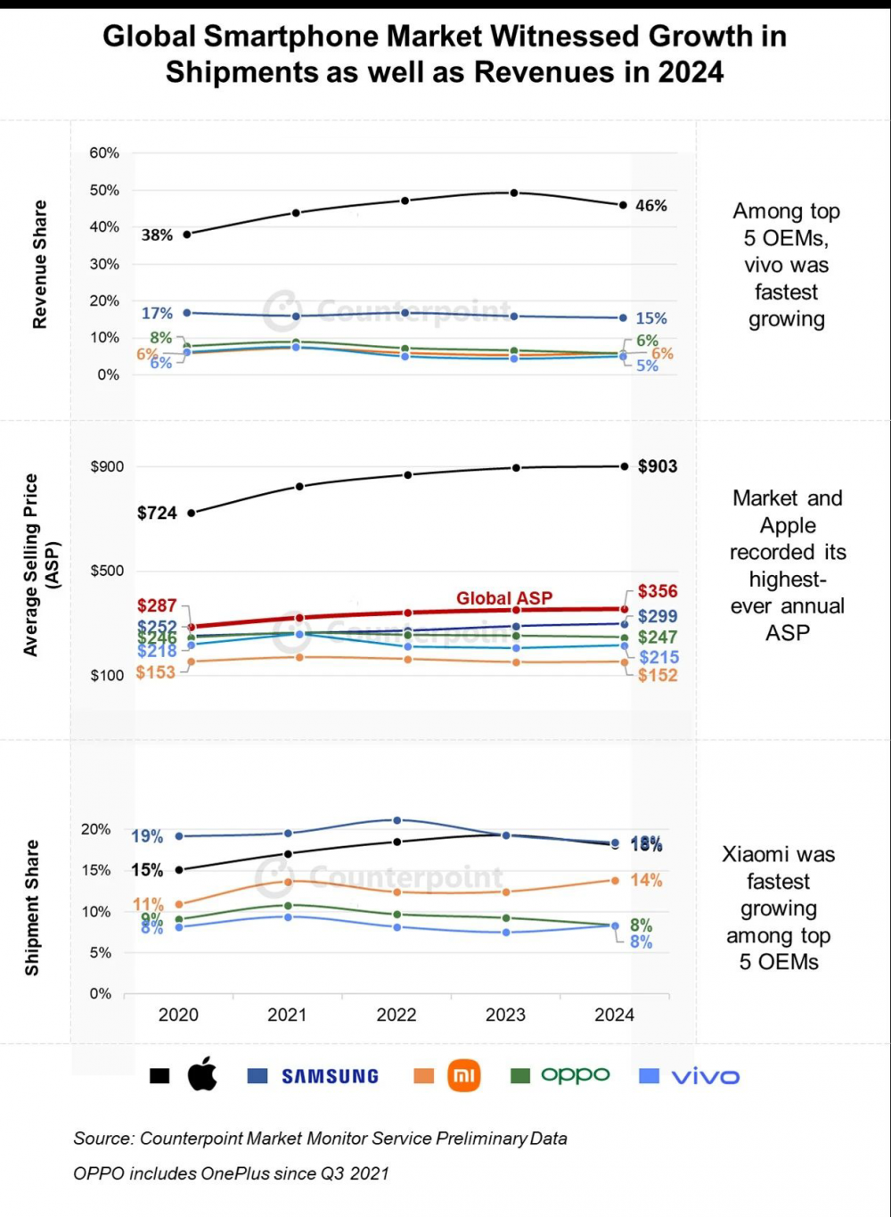 C114讯 2月7日消息(九九)根据Counterpoint 市场监测服务的最新研究,2024年全球智能手机收入同比增长5%,结束了连续两年的下降趋势,同时平均销售价格攀升至创纪录的356美元。