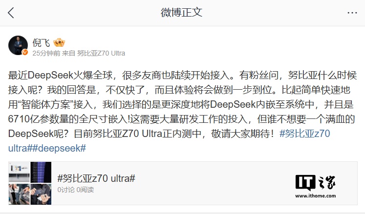IT之家注意到,刚刚努比亚总裁倪飞发文称,努比亚将很快接入 DeepSeek 而且体验将会做到一步到位。与其他厂商采用“智能体方案”接入 DeepSeek 不同,努比亚选择将 DeepSeek 深度内嵌至系统中,并且是 6710 亿参数量的全尺寸嵌入。这种深度整合的方式需要大量的研发工作投入,“但谁不想要一个满血的 DeepSeek 呢?”