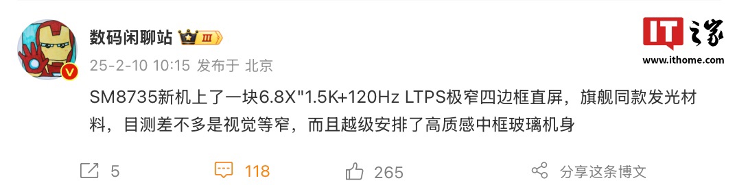 IT之家 2 月 10 日消息,博主 @数码闲聊站 今天透露一款神秘“SM8735 新机”将搭载 6.8X 英寸 1.5K+120Hz LTPS 极窄四边框直屏(博主称“目测差不多是视觉等窄”),该机还将搭载旗舰同款发光材料,而且“越级安排了高质感中框玻璃机身”。