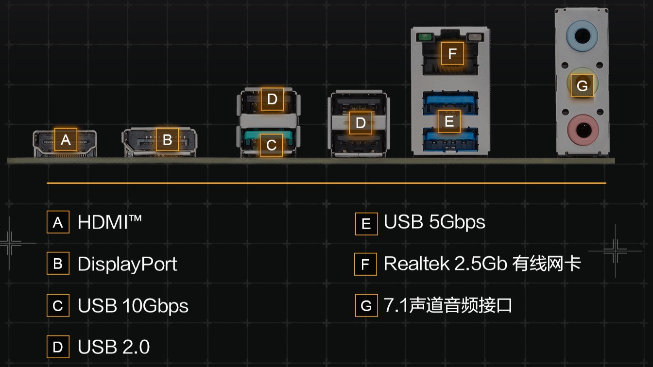 该主板的后置 I/O 面板包含 1 个 HDMI、1 个 DP、1 个 USB-C 20Gbps、1 个 USB-A 10Gbps、4 个 USB 2.0 Type-A、2 个 USB-A 5Gbps、1 个 2.5GbE RJ45、1 组三个 3.5mm 音频插孔。