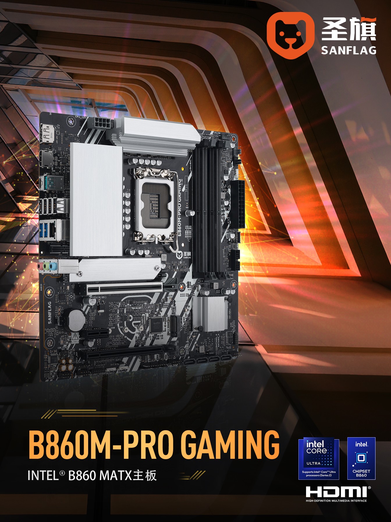 圣旗 B860M-PRO GAMING 整体设计简洁,VRM、芯片组和主 M.2 盘位搭载银白色散热马甲,后置 I/O 面板为非一体式设计。