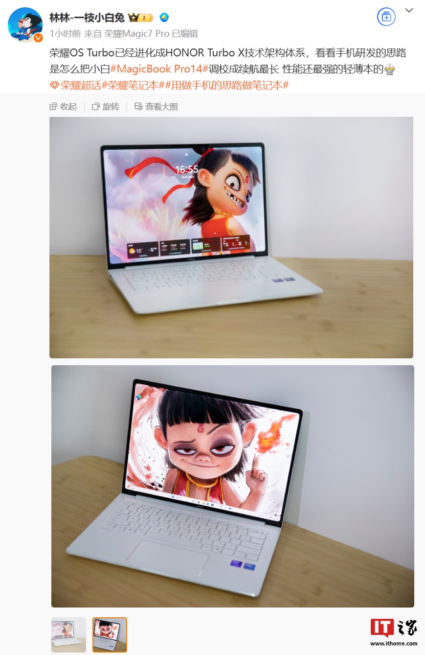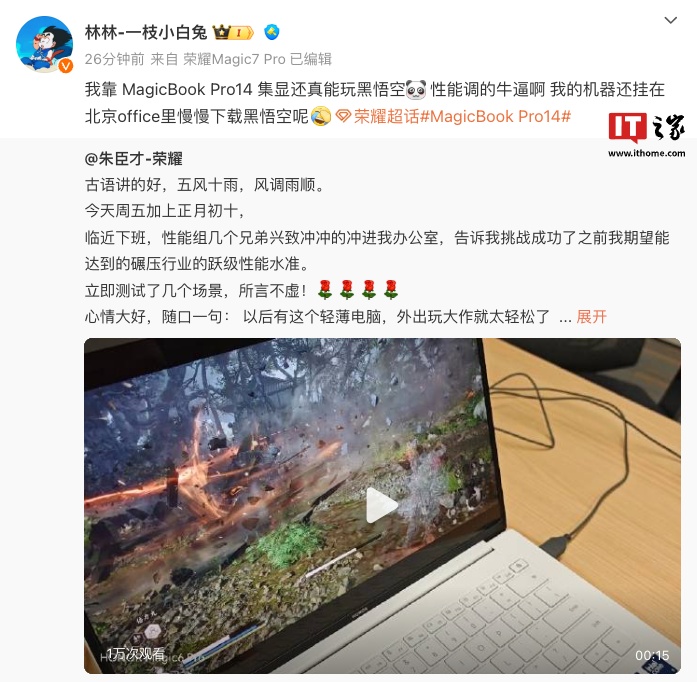 IT之家此前报道,荣耀 PC 产品线总经理 @朱臣才-荣耀 本月(2 月 7 日)分享了荣耀新品笔记本游玩《黑神话:悟空》的视频,并称性能组同事挑战成功了之前他期望能达到的碾压行业的跃级性能水准。林林当日转发该视频,并透露新笔记本命名为 MagicBook Pro 14,预计为集显本。