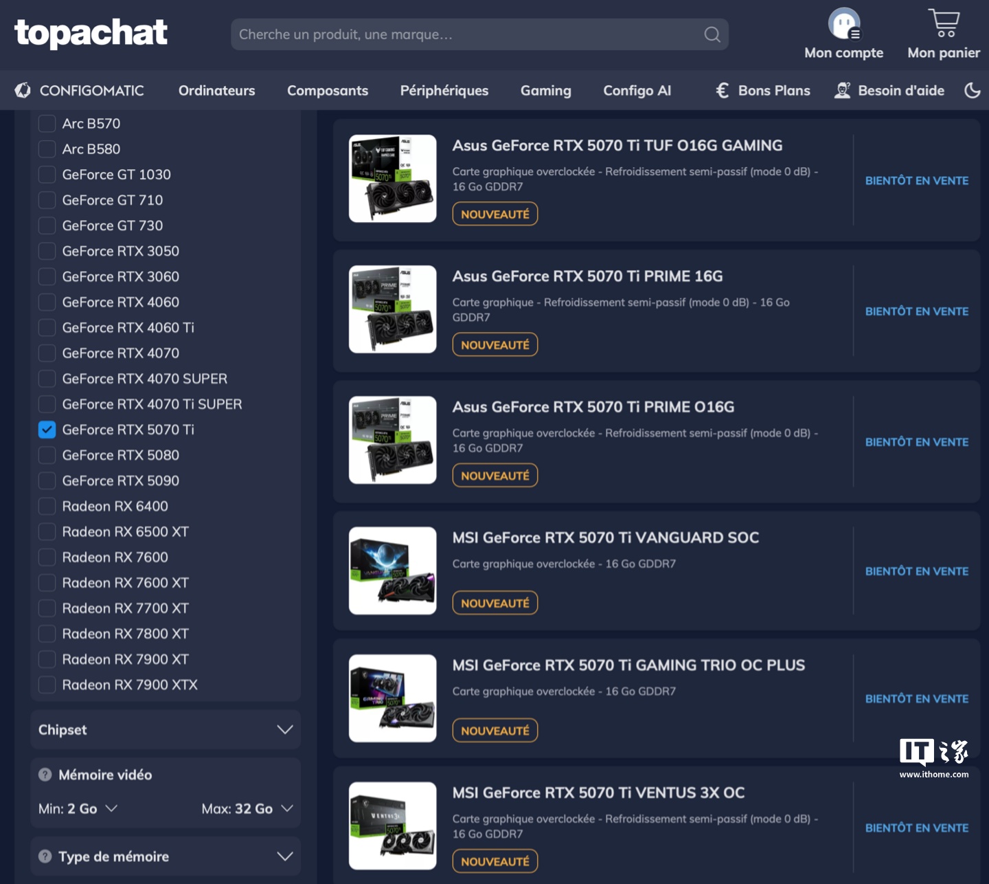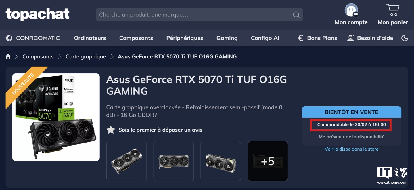 IT之家 2 月 10 日消息,法国计算机零售网站 topachat 日前上架了多款英伟达 RTX 5070 Ti 非公版显卡,但是并未公布价格,型号如下: