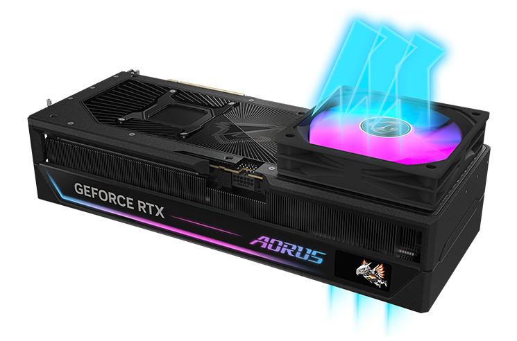 IT之家 2 月 10 日消息,技嘉在其 AORUS GeFoce RTX 5090 (D) / 5080 MASTER“超级雕”显卡上采用了一项名为“进气格栅 PLUS”的结构设计:显卡背板在散热鳍片加长的尾部留有开孔,可加装随附的配套 RGB 风扇。