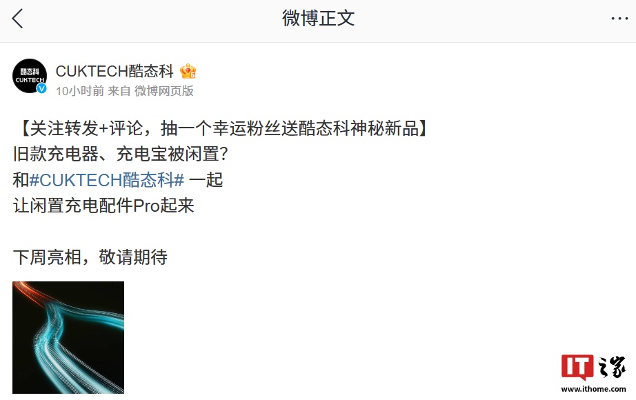 IT之家 2 月 11 日消息,酷态科新品将在下周亮相,官方宣称其支持“让闲置充电配件 Pro 起来”,同时宣传海报显示新品宣传语为“‘旧’的充电配件,‘新’的充电体验”。