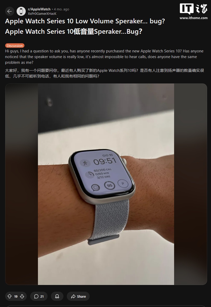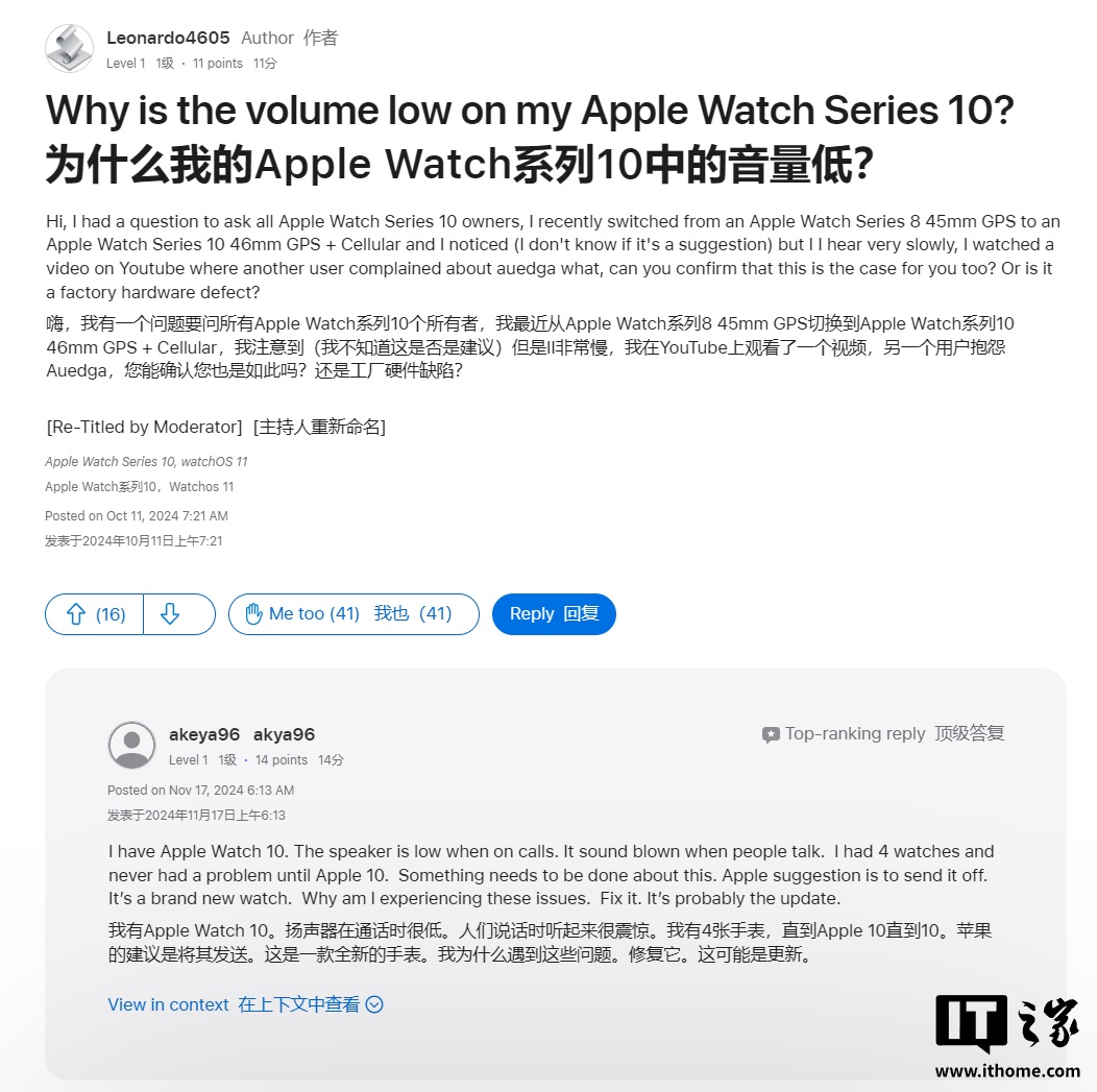 IT之家 2 月 12 日消息,据 Macrumors 报道,苹果支持社区和 Reddit 上的反馈,越来越多的用户报告称,其 Apple Watch Series 10 的扬声器在反复使用后,声音逐渐变小或变得模糊不清。即便使用了“水锁”功能(Water Lock)来排出游泳或其他水上活动后扬声器内的水分,问题依然存在。