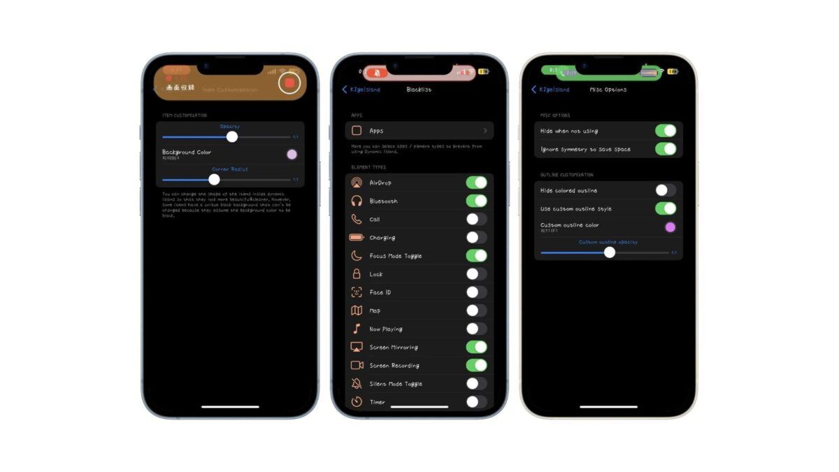 用户通过该越狱插件,可以调整灵动岛图标和元素的透明度,选择其背景颜色,并通过滑块调整圆角半径,此外可以选择阻止在灵动岛中显示的应用程序和元素类型,包括已安装的任何应用程序以及 AirDrop、蓝牙、通话、充电等多种元素。