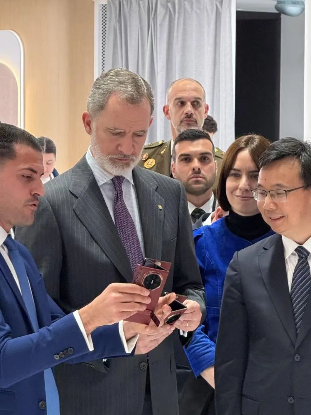 第三个关键词是折叠屏。此次华为终端、企业、运营商三大业务展台集体亮相MWC,虽然华为终端此次没有专门举行新品发布会,但展台带来了全场景设备的全家桶,其中三折叠最吸引国外用户关注。西班牙国王费利佩六世更是到访华为终端展台,现场体验三折叠。
