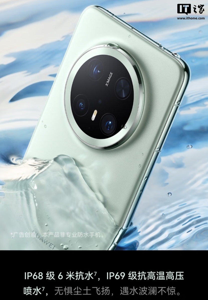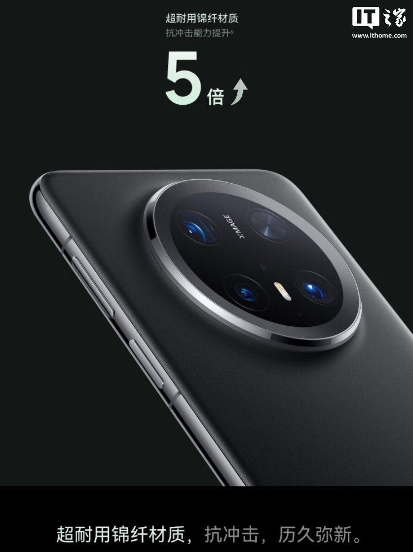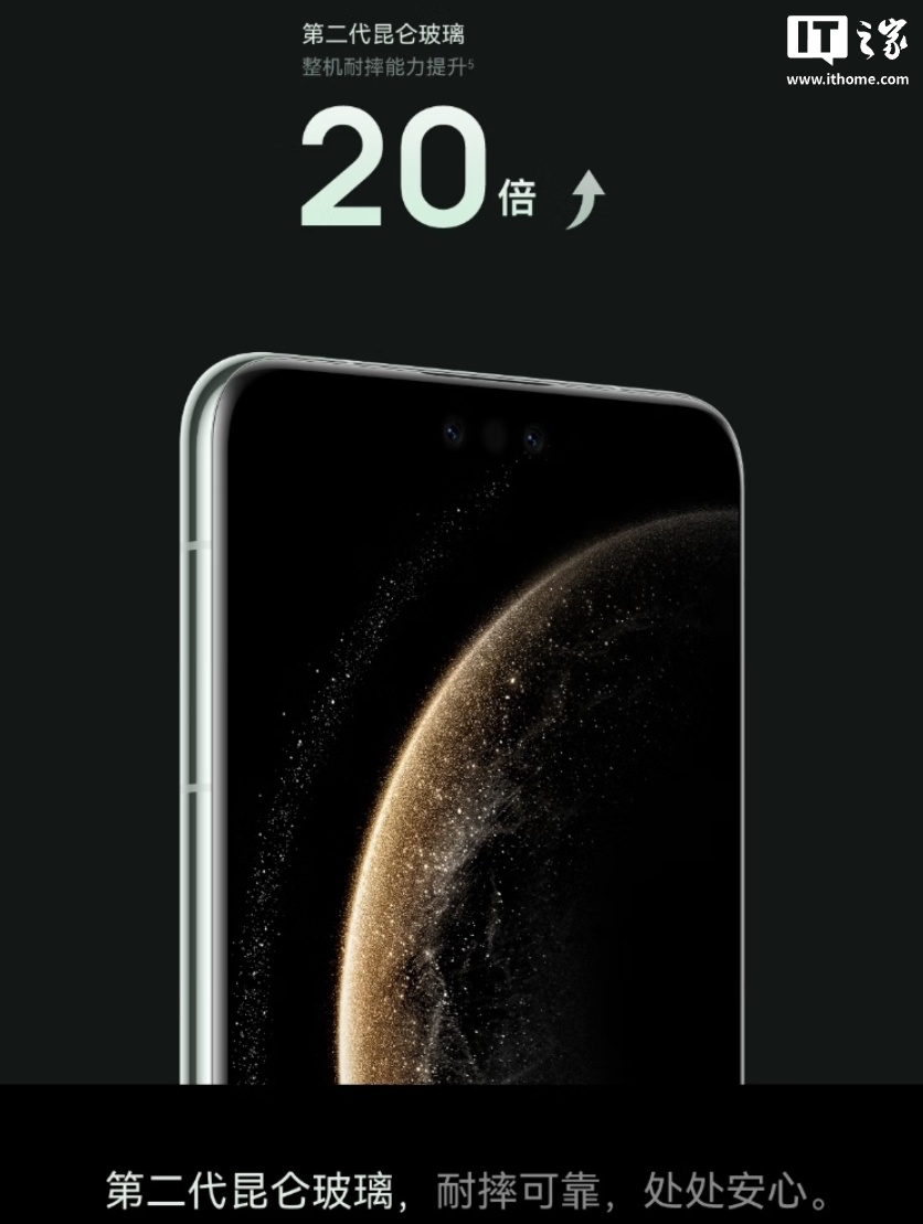 新机配备第二代昆仑玻璃,宣称整机耐摔能力提升 20 倍;后盖采用锦纤材质,宣称抗冲击力提升 5 倍。该机还支持 IP68 级 6 米抗水、IP69 级抗高温高压喷水。