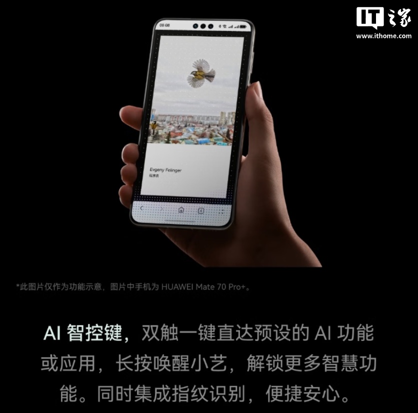 华为 Mate 70 Pro 优享版配备 AI 智控键(支持双触一键直达预设 AI 功能或应用),支持鸿蒙 AI,可提供 AI 动态照片、AI 运动轨迹、AI 主角时刻、AI 云增强、AI 互动主题、AI 隔空传送、AI 通话、AI 摘要、AI 降噪通话、AI 消息随身等功能。