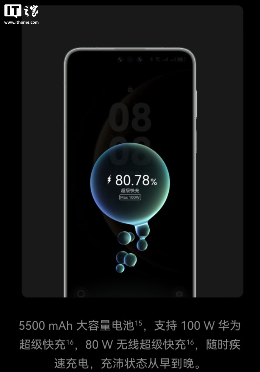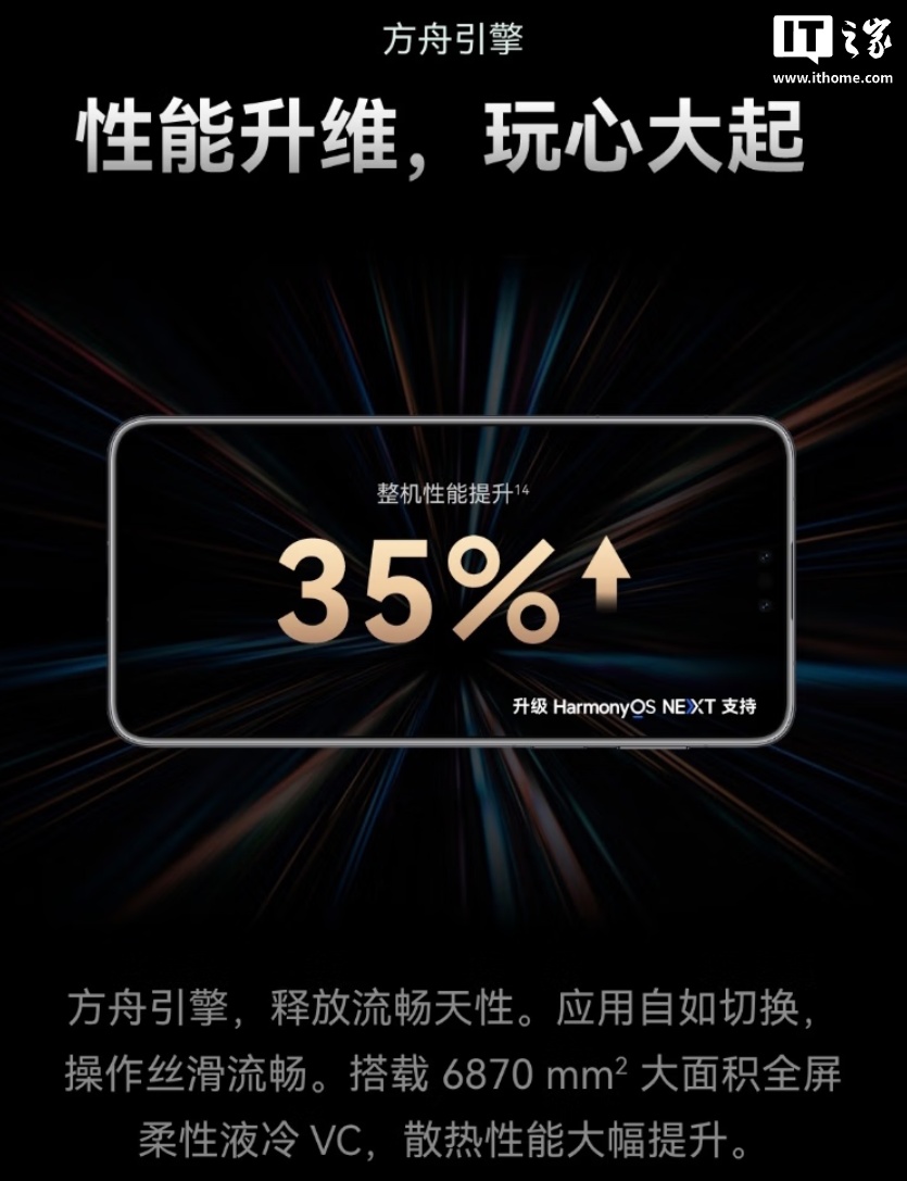 华为 Mate 70 Pro 优享版内置方舟引擎,搭载 6870mm² 大面积全屏柔性液冷 VC,整机性能提升 35%,新机配备 5500mAh 电池,支持 100W 有线超级快充 + 80W 无线超级快充。
