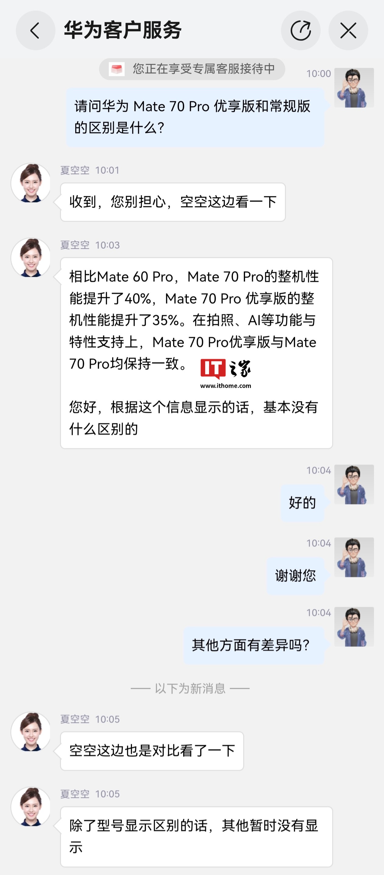 华为 Mate 70 Pro 优享版手机在外观上、硬件配置等方面与常规版 Mate 70 Pro 基本一致,客服称:相比 Mate 60 Pro,Mate 70 Pro 的整机性能提升了 40%、Mate 70 Pro 优享版的整机性能提升了 35%。在拍照、AI 等功能与特性支持上,Mate 70 Pro 优享版与 Mate 70 Pro 均保持一致。