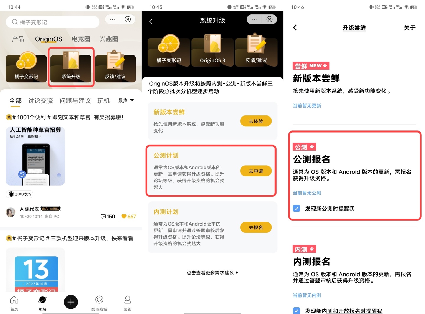 2、在 iQOO 社区「** 快应用端 ** 」版块页点击“OriginOS--系统升级--公测计划--去申请--公测计划--查看详情”,然后根据提示进行申请。(上述机型如无系统升级专区,请先将快应用更新至最新版本,升级方法:手机桌面--设置--应用与权限--系统应用设置--快应用--检查更新)