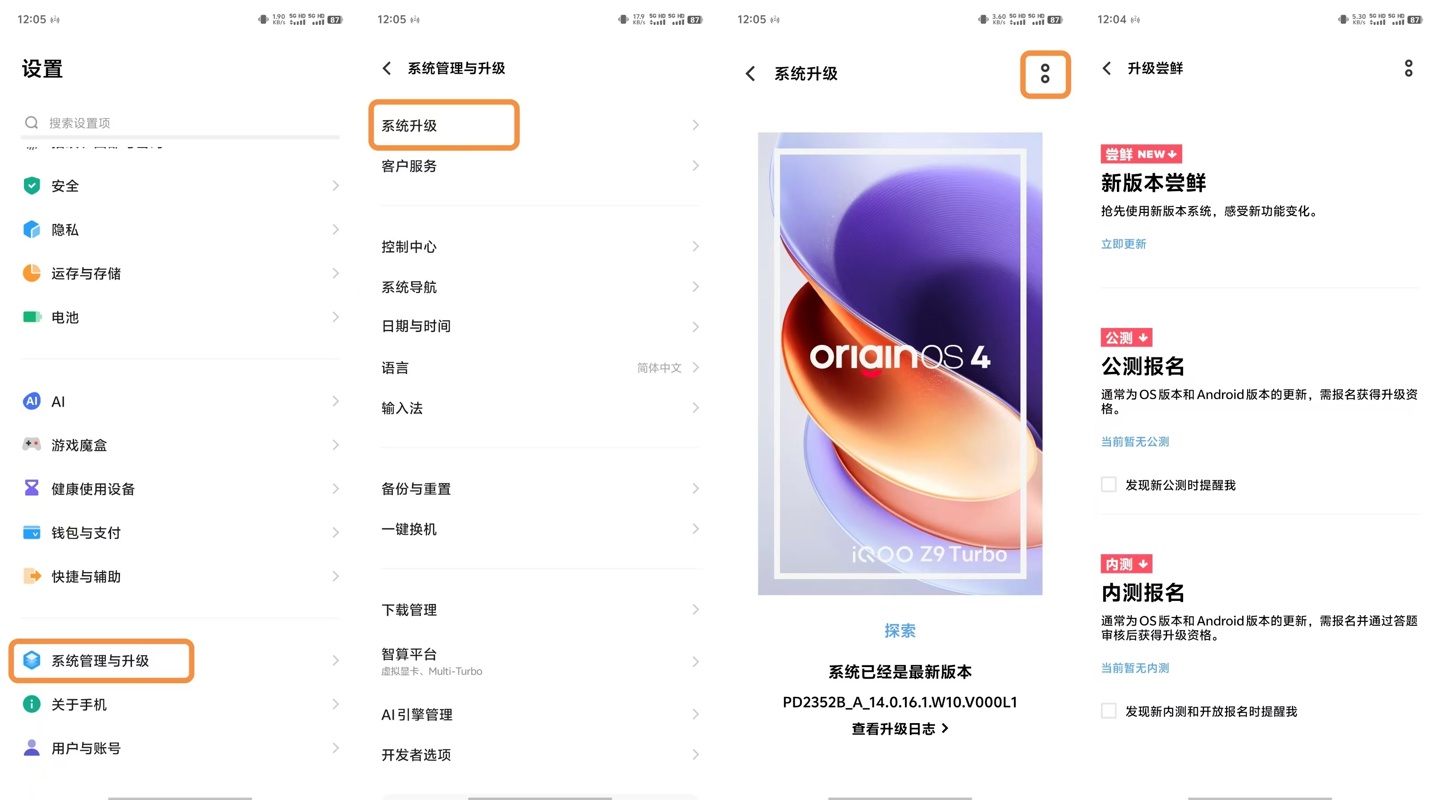 2、进入“设置 > 系统管理与升级 > 系统升级 > 右上角两点 > 升级尝鲜 > 新版本尝鲜”检测更新。