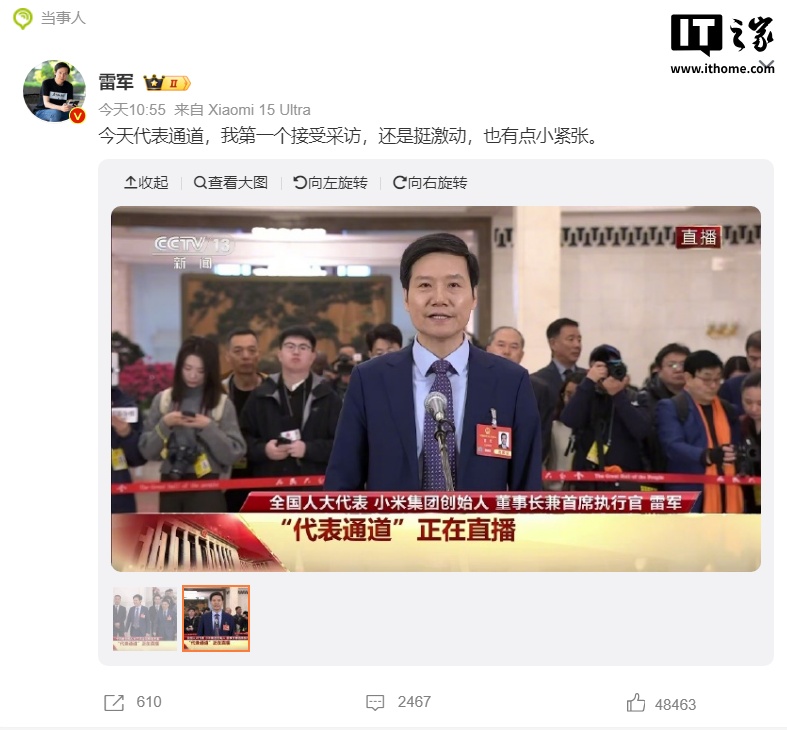IT之家 3 月 5 日消息,全国人大代表、小米创办人兼董事长兼 CEO、金山软件董事长雷军今日在十四届全国人大三次会议首场“代表通道”接受记者提问。