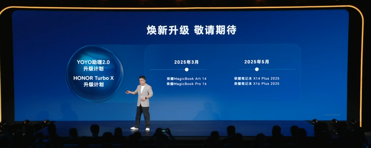据此前报道,在今年 2 月 26 日下午的荣耀 AI PC 战略暨 MagicBook Pro 14 新品发布会上,荣耀笔记本全面进化至 HONOR Turbo X 技术,宣布 YOYO 助理升级 2.0。另外,该版本 YOYO 助理将在 3 月起面向部分荣耀笔记本老用户推送升级:
