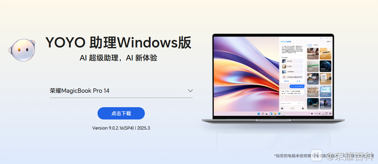方式二:访问荣耀 YOYO 助理官网,找到荣耀 MagicBook Pro 14 产品,下载安装 9.0.2.16 (SP4) 或以上版本。