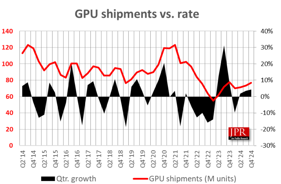 3月3日,市调机构Jon Peddie Research在报告中指出,2024年第四季度全球基于PC的图形处理器 (GPU) 市场增长6.2%至7800万台,PC CPU出货量增加至7200万台。总体而言,GPU在2024年至2028年的复合年增长率为 -1%,并在预测期结束时达到30.08亿台的安装基数。未来五年,独立GPU (dGPU) 在PC 中的渗透率将达到 15%。