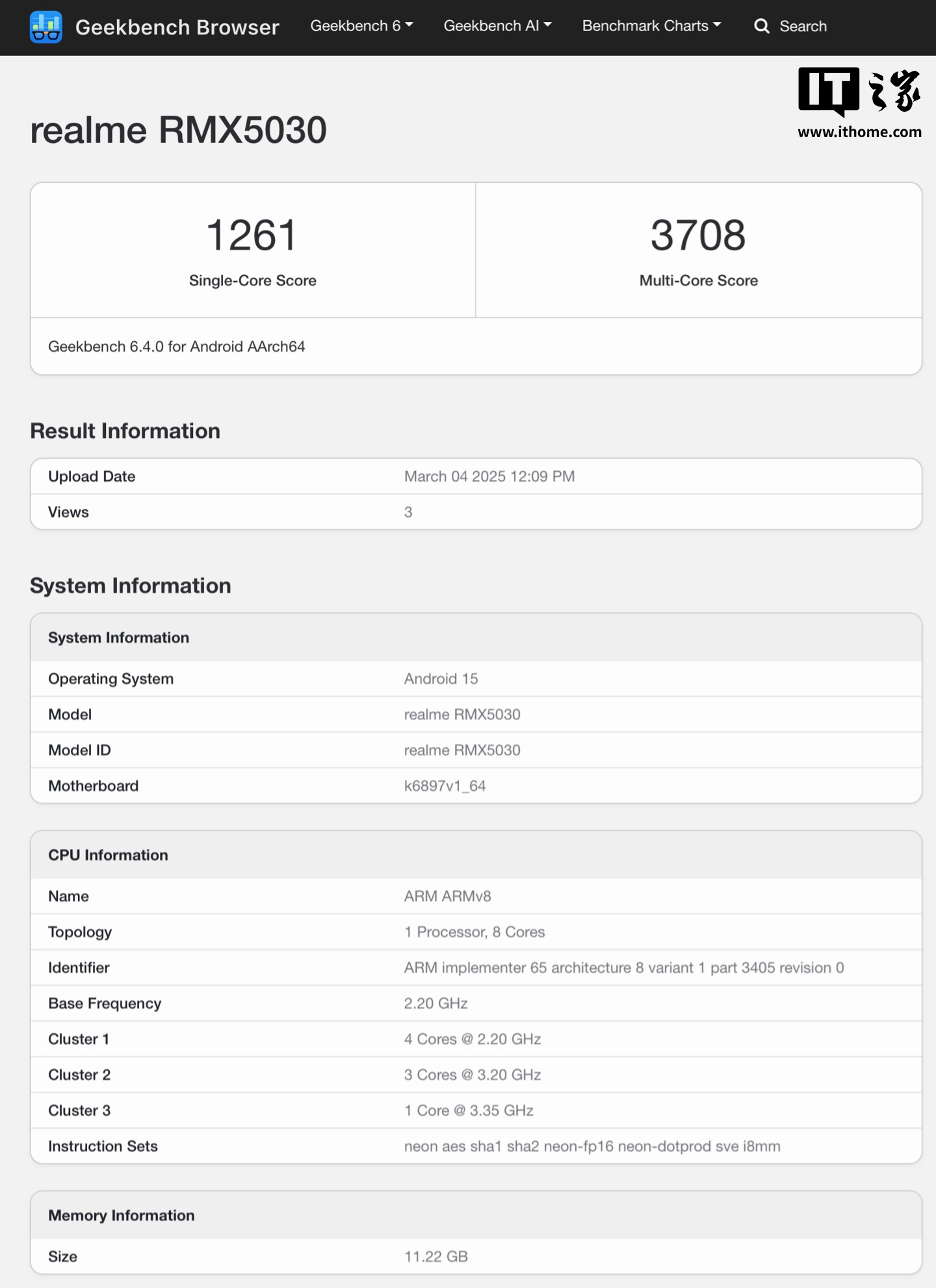 IT之家参考跑分库,这款 realme P3 Ultra 手机具体型号为 RMX 5030,手机配备联发科天玑 8350 芯片,搭载 12GB RAM 和安卓 15 系统。