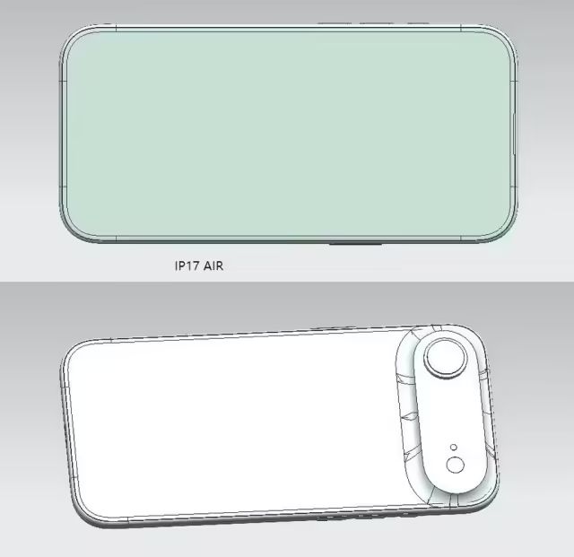 从网传渲染图来看,iPhone 17 Air 的后置镜头模组采用横向条形跑道设计,模组内只配备一颗摄像头,位于左侧,右侧则是麦克风和 LED 闪光灯。