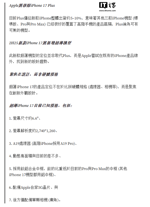 比如郭明錤声称,苹果尝试在既有的 iPhone 产品线外,找到新的设计趋势,超薄 iPhone 17 的定位不在于比拼硬件规格,而是聚焦在创新外观设计。