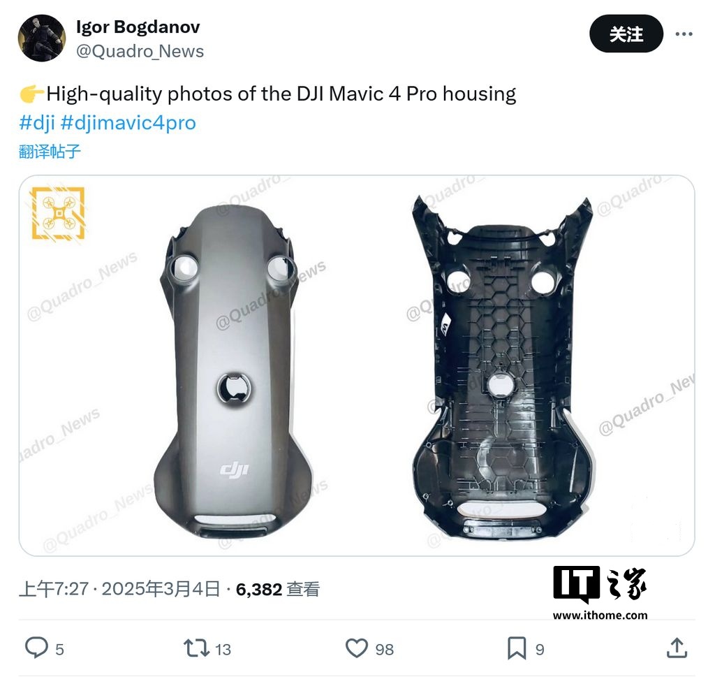 本周预计会有更多关于 Mavic 4 Pro 的泄露信息公布。目前,已有该无人机在户外飞行的照片以及外壳原型的图片流出,这些原型来自中国工厂的模具加工过程,最终产品将进行表面处理。