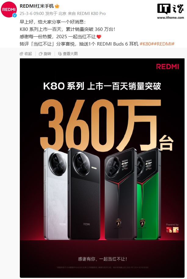 IT之家 3 月 6 日消息,小米 REDMI 今日宣布,K80 系列上市一百天,累计销量突破 360 万台。