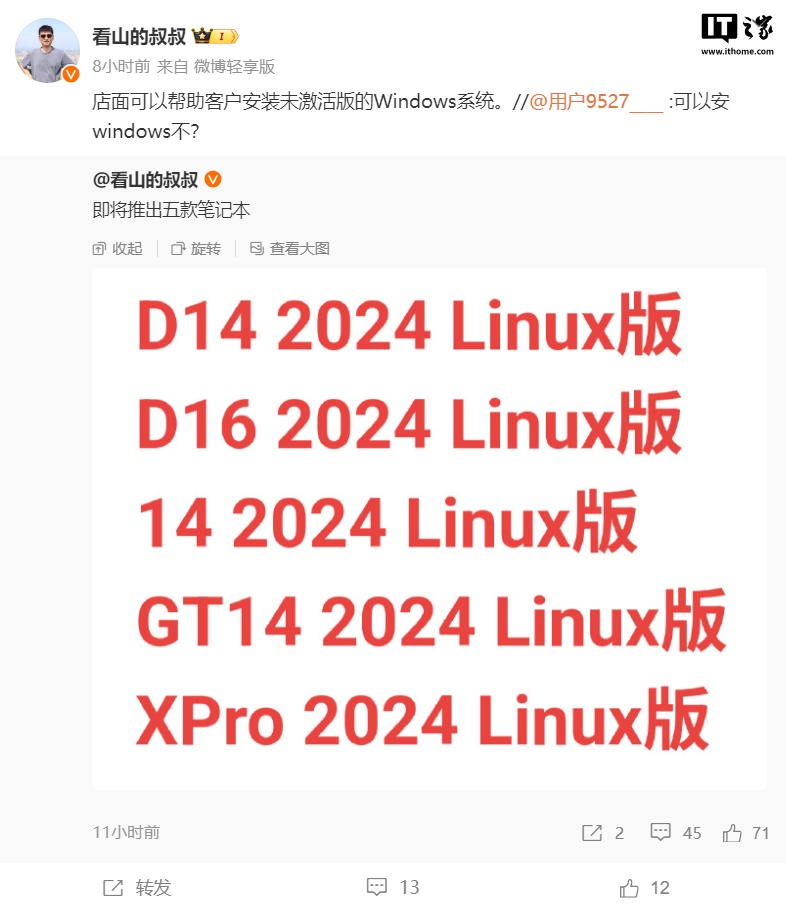 从爆料命名来看,新机有望是 2024 款笔记本换装 Linux 系统版本。爆料还称,店面可以帮助客户安装未激活版的 Windows 系统。
