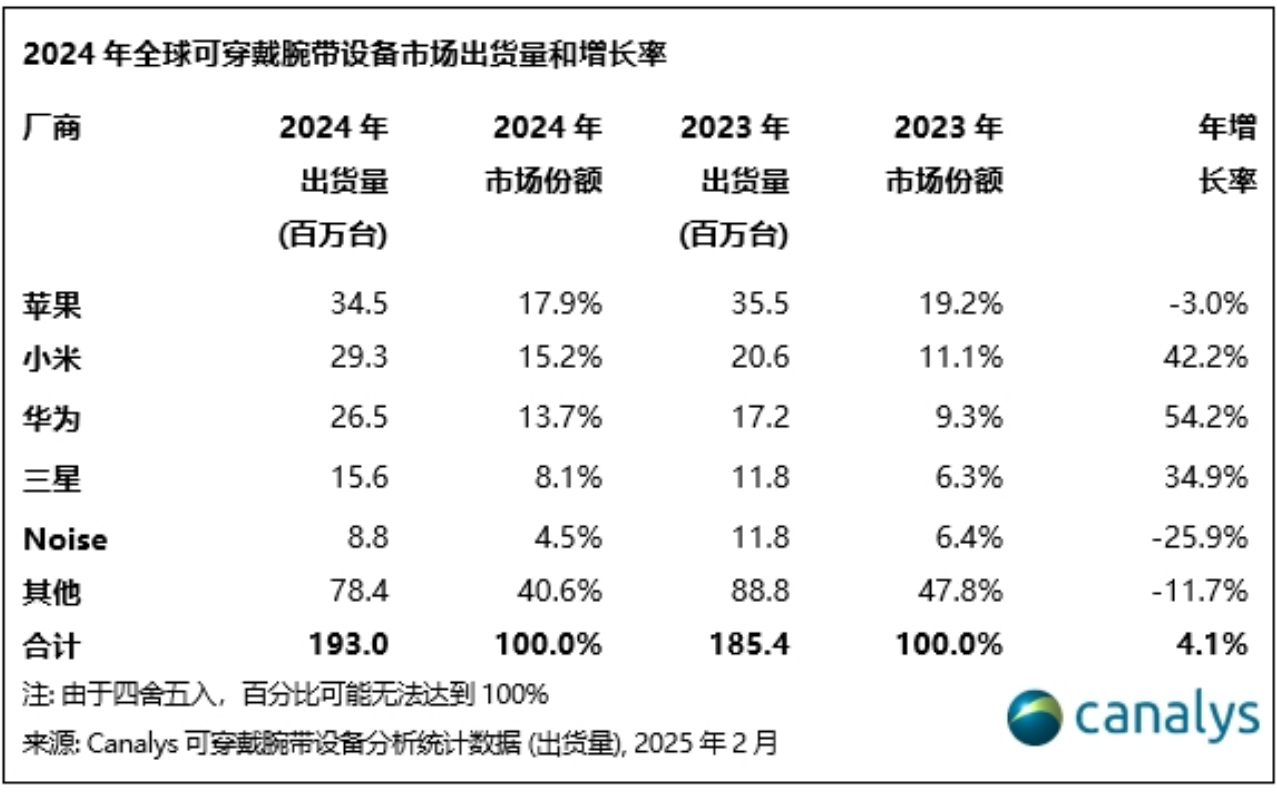 IT之家 3 月 6 日消息,据 Canalys 最新数据,2024 年,全球可穿戴腕带设备市场实现稳步增长,出货量达 1.93 亿部,同比增长 4%。这是继 2022 年市场调整后,连续两年实现增长。