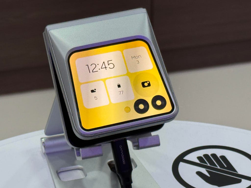 最后,三星显示公司对其Z Flip翻盖系列进行了更独特的诠释——与去年Galaxy Z Flip 6的简约现代风格截然不同,该公司围绕复古未来主义风格重新设计了其外部显示屏,采用多边形灰色塑料,类似于迪士尼乐园的太空山或老式PC和苹果电脑的外壳。这是一种前卫的设计,如今已成为可折叠手机设计中的一股清流。