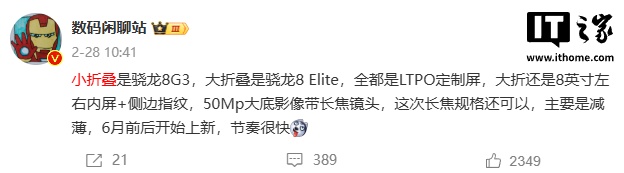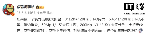 IT之家 3 月 7 日消息,博主 @数码闲聊站 昨日发文暗示某厂骁龙 8 旗舰大折叠部分配置,预计为荣耀旗下新机。