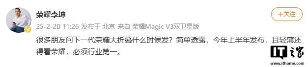 而荣耀终端股份有限公司旗舰手机产品经理李坤此前也确认,下一代荣耀大折叠今年上半年发布,轻薄“必须行业第一”。