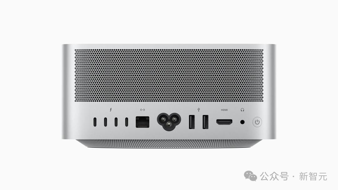 新款Mac Studio外观设计与上一代一致,配备了四个Thunderbolt 5接口,两个USB-A接口、一个HDMI接口和一个10GB以太网接口,以及耳机插孔。