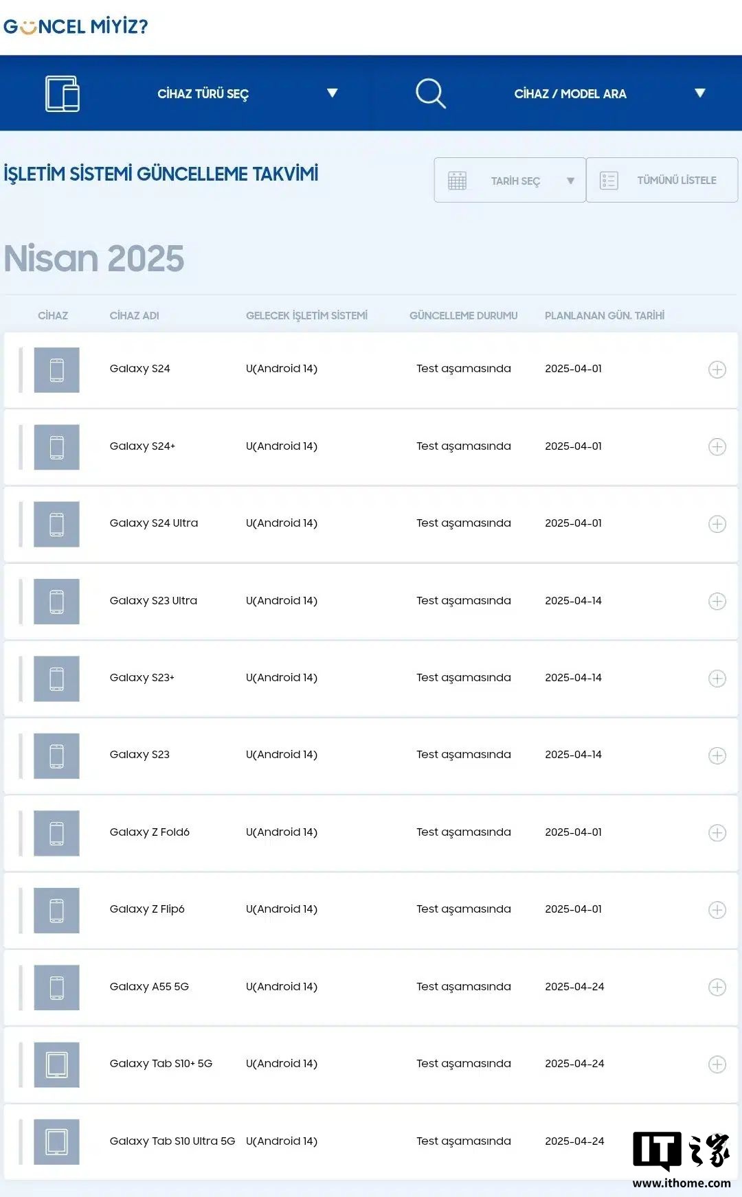 消息称该适配时间表来自三星土耳其会员社区,详细列出了 One UI 7.0 稳定版的完整发布计划。涉及的设备包括 Galaxy S24 系列(不包括 FE)、Galaxy S23 系列(不包括 FE)、Galaxy Z Fold 6、Galaxy Z Flip 6、A55 5G、Tab S10+ 5G 和 Tab S10 Ultra 5G。