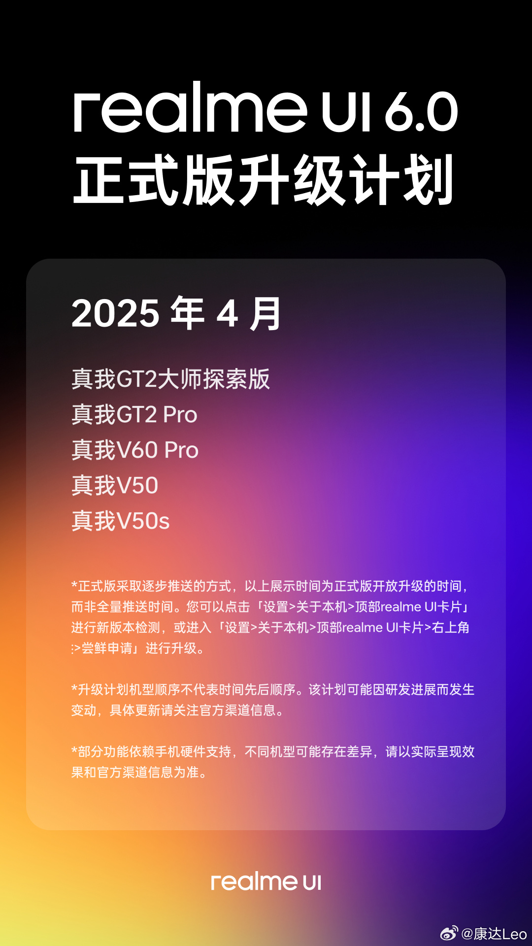 2025 年 4 月,将有 5 款机型获得 realme UI 6.0 正式版更新: