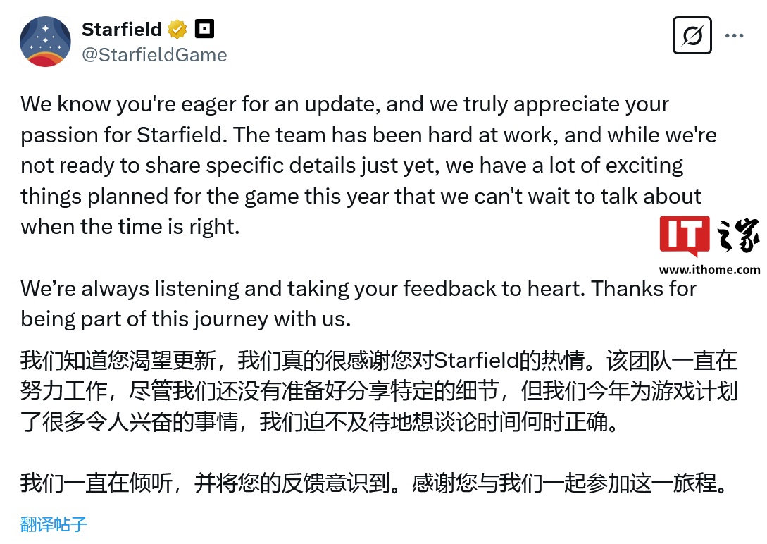 IT之家 3 月 7 日消息,B 社(Bethesda)昨日(3 月 6 日)在 X 平台发布推文,向《星空》(Starfield)玩家传递了积极信号,表示团队正“全力投入”,为 2025 年开发更多内容,但未透露具体细节。