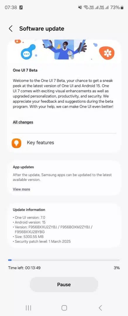 IT之家注:Galaxy Z Fold 6 的首个 One UI 7.0 测试版更新已开始推送,固件版本号为 ZYBJ,并包含 2025 年 3 月的安全补丁。此次 OTA 更新包大小超过 5GB,符合重大操作系统更新的标准。