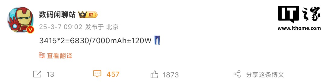 IT之家 3 月 7 日消息,博主 @数码闲聊站 发文透露 iQOO 旗下一款神秘“中端”新机将搭载双 3415 毫安时电芯,该机同时将支持 120W 有线快充。参考评论区,该机有望为 iQOO Neo10S Pro+ 机型。