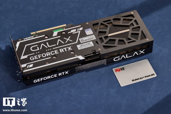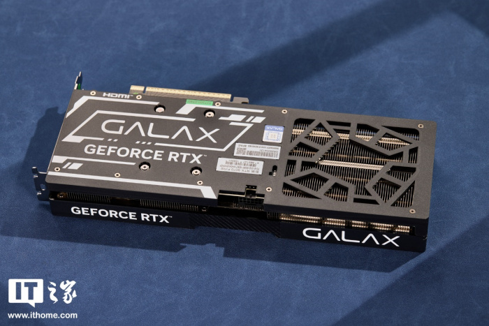 显卡背板的设计也和影驰 RTX 5090 D 大将基本保持一致,只是左侧的字母印花范围更大,右侧还是以圆角矩形开口为基础,内部做了四个梯形斜对称的个性镂空装饰。